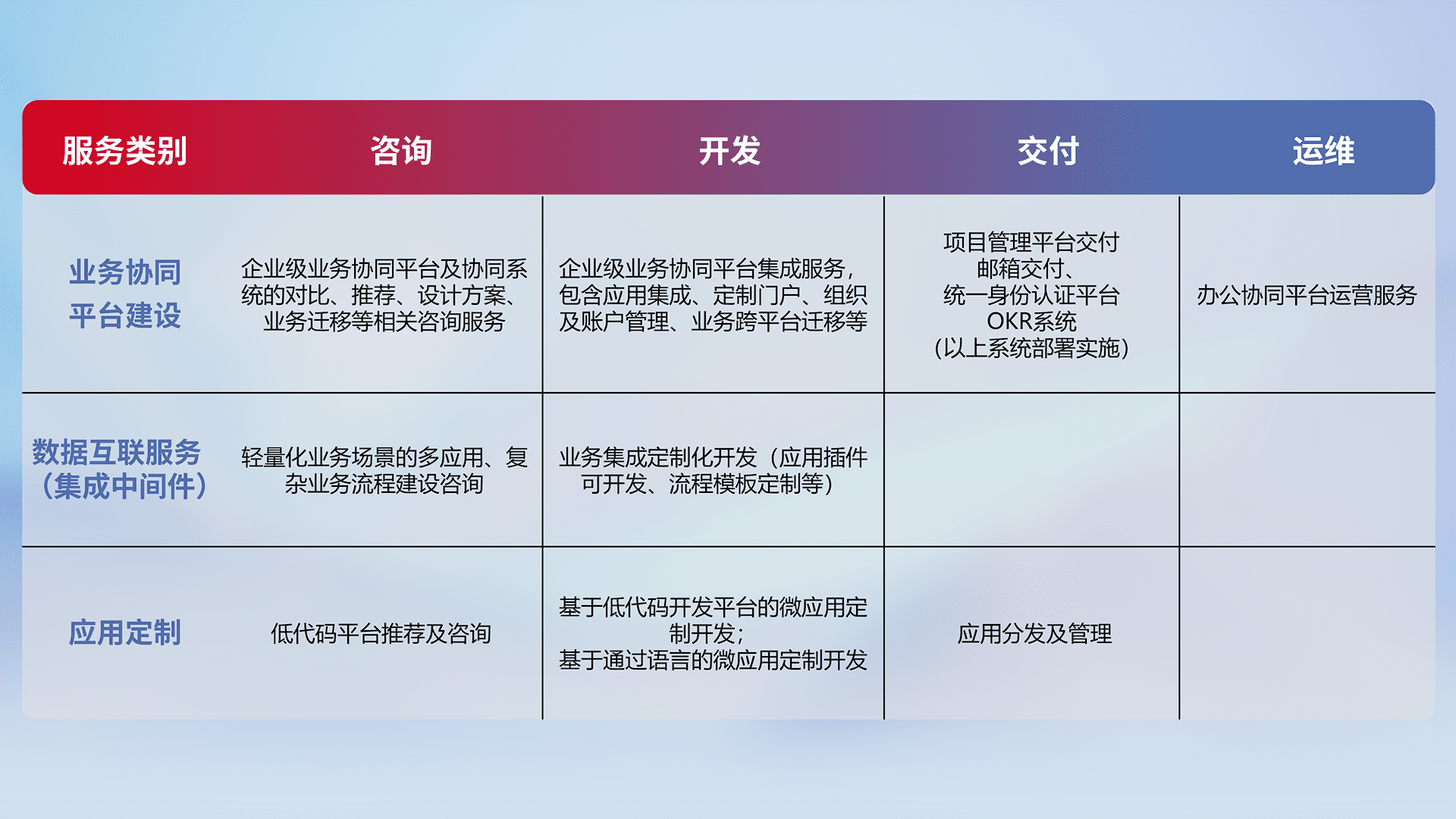 针对钉钉、、、企微、、、IDaas等平台级产品提供产品的规划、、方案、、、、交付、、定制化开发等服务,,,实现如统一协同办公、、智能客户服务、、、、混合会议管理、、、、智能数据查询、、等业务场景,,实现数字化转型。。